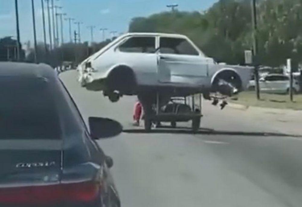 Hay imágenes que dan una enorme curiosidad, además de dejar perplejos a propios y extraños, como lo que ocurrió con un cartonero que llevaba un Fiat 147 en la parte de su carro.