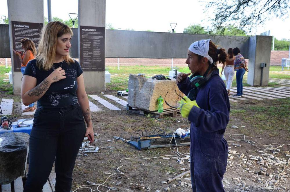 El Parque de la Memoria de Margarita Belén - ubicado en el kilómetro 1042 de la Ruta 11 - recibe a los chaqueños, Itatí Cabral y Alejandro Pérez, junto a Carina Favaro de La Rioja y Daniela Almeida de Corrientes quienes ejecutan la obra colectiva sobre bloques de mármol y granito gris.