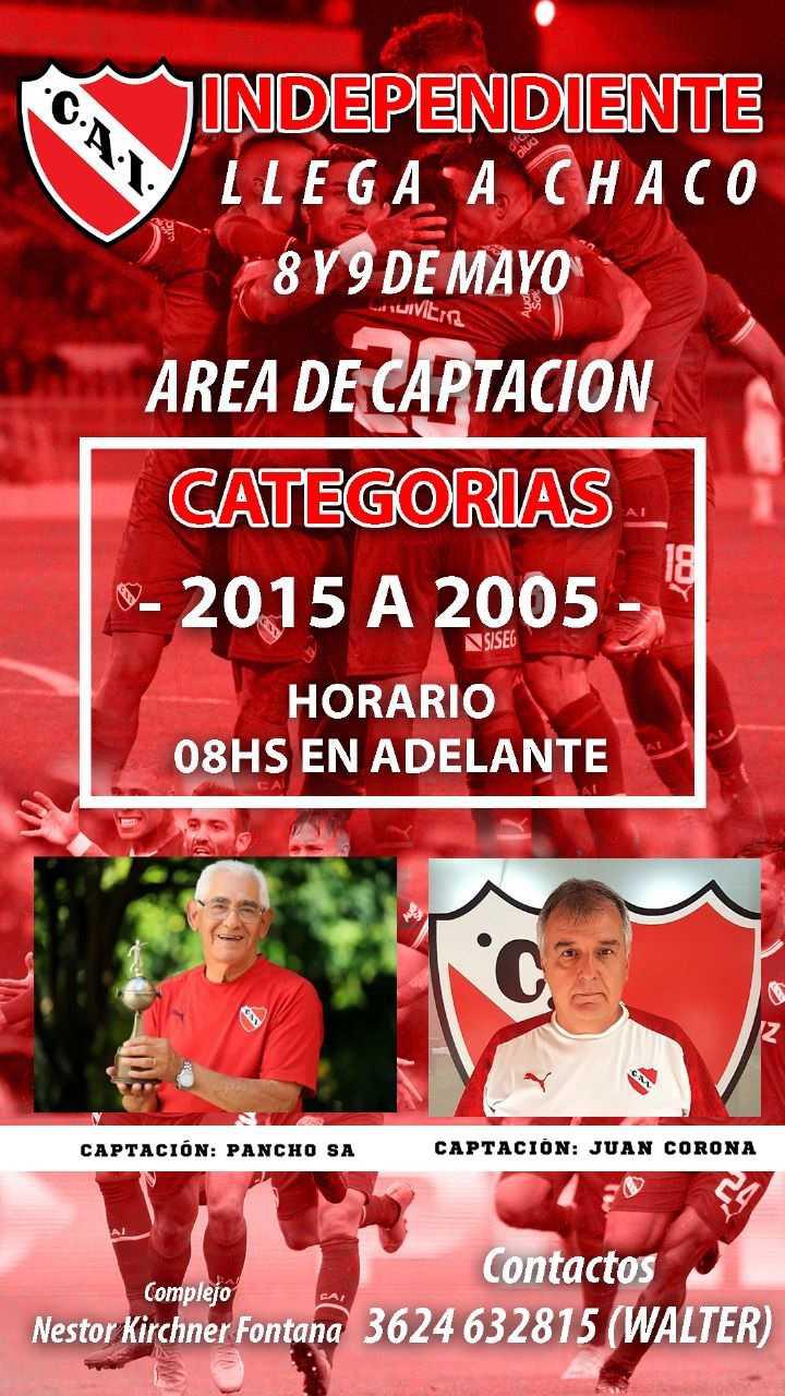 La Peña Independiente 2000 organiza junto al Área de Captación del Club Atlético Independiente, una doble jornada de prueba de jugadores 2005 a 2015 que se realizará el 8 y 9 de mayo en el Complejo “Néstor Kirchner” de la ciudad de Fontana.