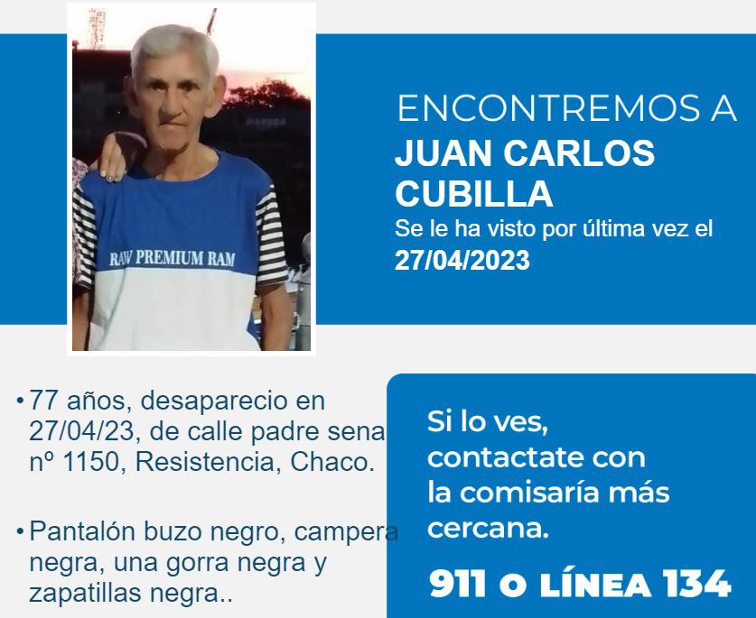 En base a una denuncia registrada en Comisaría Cuarta de Resistencia, la Policía del Chaco solicita colaboración para dar con el paradero de Juan Carlos Cubilla, un adulto mayor de 72 años, que fue visto por última vez el miércoles 1 de febrero.