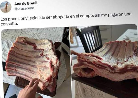 “Los pocos privilegios de ser abogada en el campo: así me pagaron una consulta”, indicó. Allí se podía ver un gran costillar.