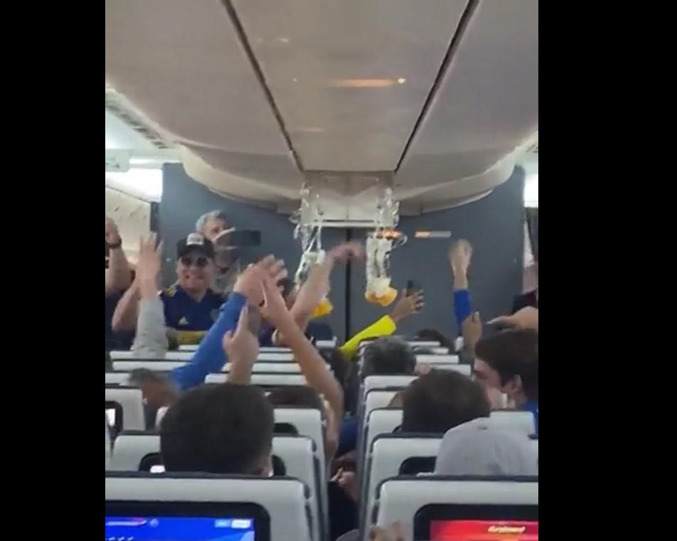 En uno de los tantos vuelos que salieron rumbo a Brasil, un grupo de fanáticos xeneizes no pudo esperar a aterrizar y se pusieron a alentar y activaron las máscaras de oxigeno. El video registrado por un pasajero se convirtió en viral en pocos minutos.
