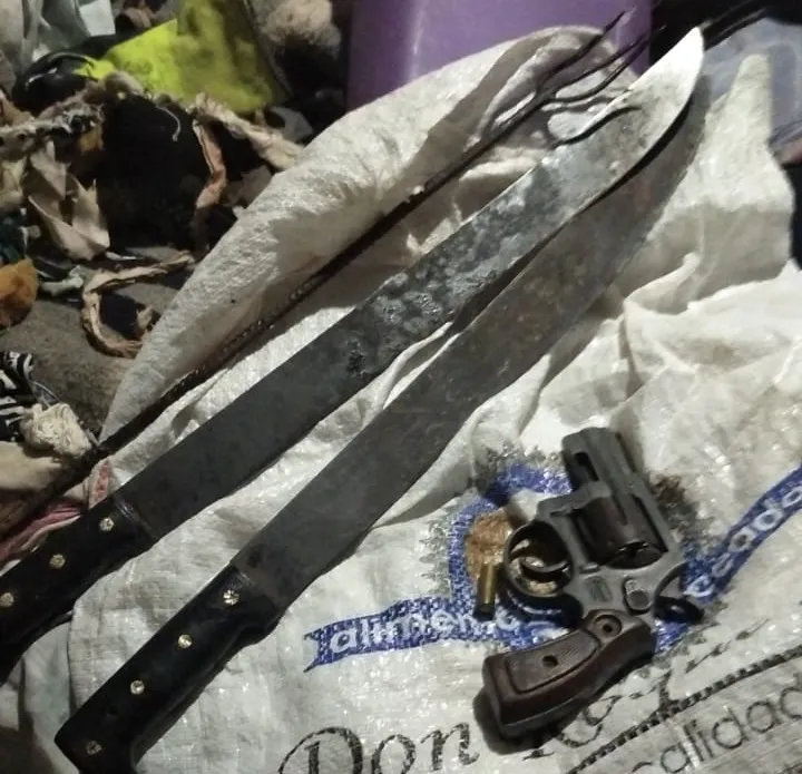 Dentro de la vivienda se secuestraron un revolver calibre 38, cuatro proyectiles del mismo calibre, cinco vinas servidas del mismo calibre, dos machetes, un hierro con punta filosa y diversos cartuchos de distintos calibres.