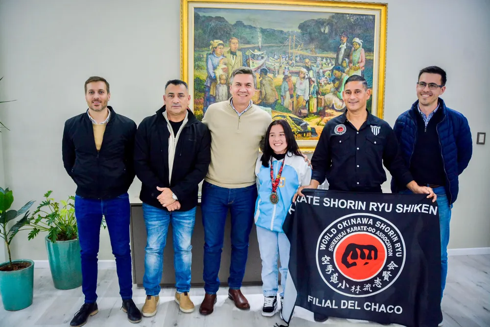 El gobernador Leandro Zdero recibió a la Karateka chaqueña Melani Alegre, quien días atrás, logró un triunfo en el Mundial de Karate en Monterrey, México, que la consagró como campeona en la categoría de Kata, cinturón negro, representando a la Argentina. Acompañado por el presidente del Instituto del Deporte Chaqueño, Fabio Vázquez; el presidente de Lotería Chaqueña, Lucas Apud Masín agradeció a la atleta por dejar en alto al nivel deportivo provincial.*