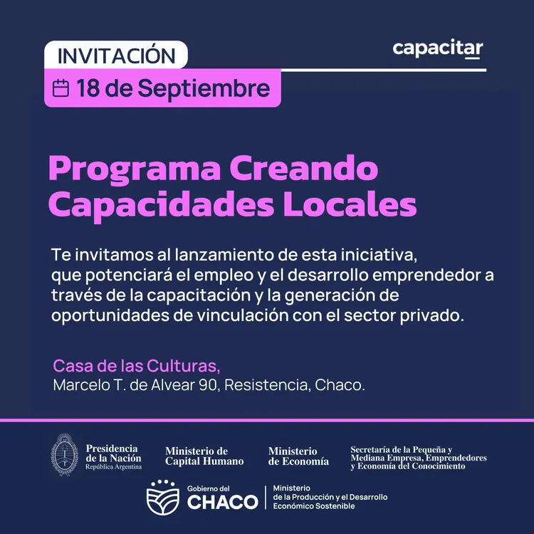 Este miércoles, 18 de septiembre, se realizará en Chaco el lanzamiento de la propuesta nacional “Creando capacidades locales”, proyectada para brindar las herramientas necesarias que aporten al desarrollo y crecimiento de los emprendedores de todo el país, replicando como base el trabajo que viene realizando en nuestra provincia el Ministerio de la Producción y el Desarrollo Económico Sostenible, a través de las Subsecretarías de Emprendedurismo Urbano y Rural y de Industria, Empleo y Comercio.