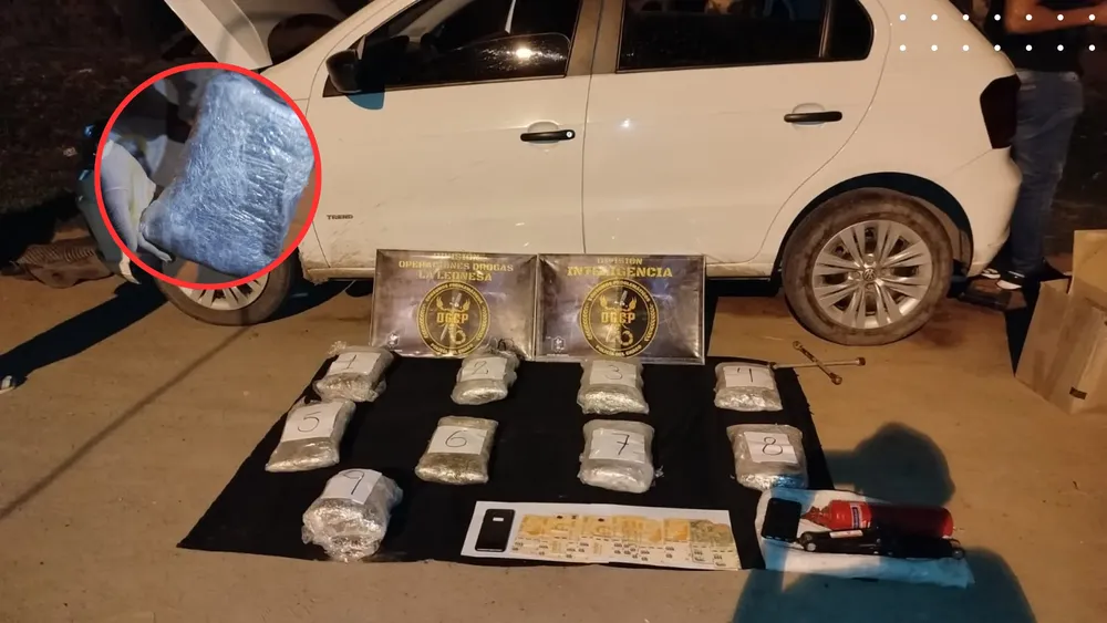El operativo se llevó a cabo en la calle Soberanía Nacional, donde el sospechoso, Victor Hugo Prado, de 37 años, fue encontrado con la marihuana en nueve paquetes termosellados, un celular, 14 mil pesos en efectivo y un auto Volkswagen Gol Trend que tenía pedido de secuestro por un robo en Santiago del Estero.