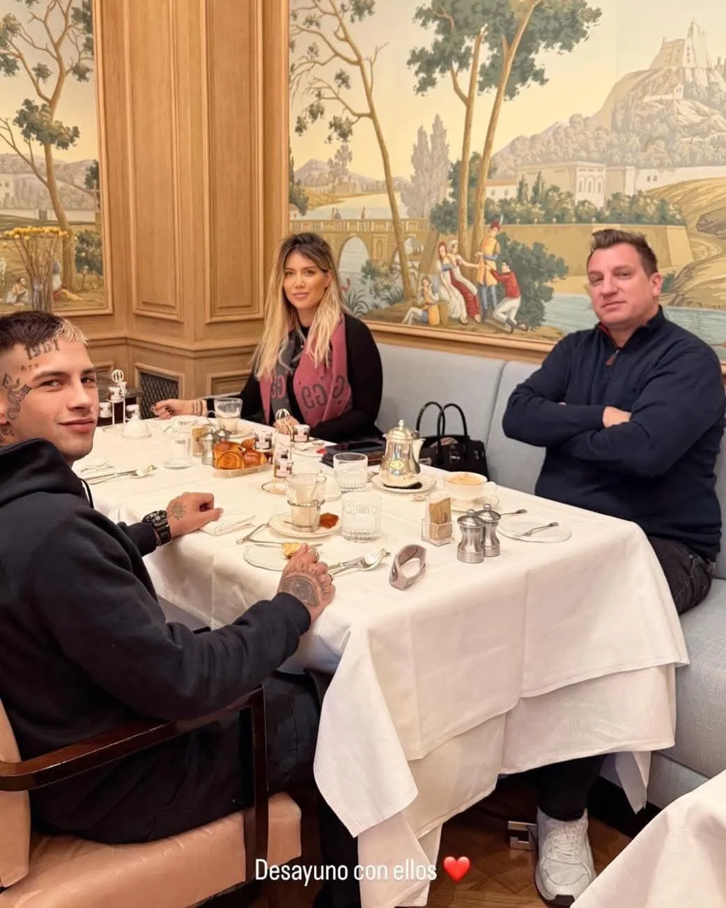 En la fotografía se los puede ver a los tres compartiendo un desayuno privado, todos con caras de las más distintas. Mientras que Wanda y L-Gante se los vio más sonrientes e incluso matcheando sus bebidas en el mismo vaso de vidrio con lo que habría sido un capuchino, Maxi López exhibió un ceño más discreto y para diferenciarse de los amantes eligió pedirse un café con leche en una taza de porcelana. Todos compartieron casi media docena de croissants, sin embargo, a pesar de la abundancia de comida, el plato del exfutbolista se vio intacto. A este momento la modelo agregó "Desayunando con ellos" junto a un emoji de un corazón enrojecido.