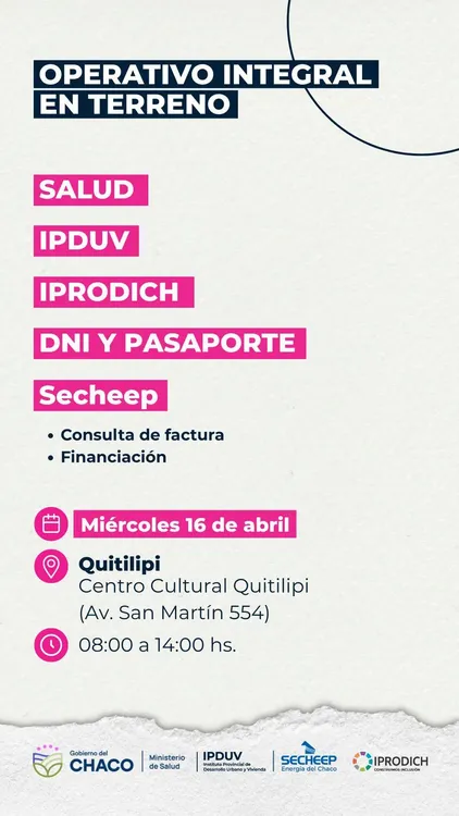 Avanzando con la asistencia a la comunidad, el Operativo Integral en Terreno llevado a cabo por el Gobierno provincial llegará este miércoles 16 de abril a Quitilipi, con el objetivo de acercar a la comunidad distintos organismos para brindar asesoramiento y facilitar trámites esenciales.