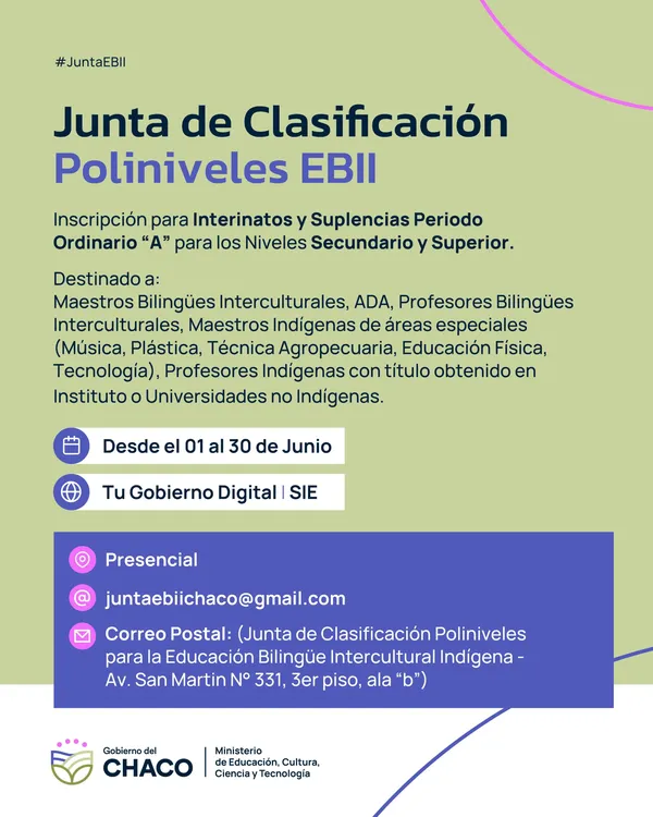 El Ministerio de Educación, a través de la Junta de Clasificación Poliniveles para la Educación Bilingüe Intercultural Indígena, comunica que a partir del 1 de junio, y hasta el 30 del mismo mes, se realizarán las inscripciones para Interinatos y Suplencias Periodo Ordinario “A” para los niveles Secundario y Superior. Esta inscripción está destinada a Maestros Bilingües Interculturales, Auxiliares Docentes Aborígenes, Profesores Bilingües Interculturales, Maestros Indígenas de áreas especiales -Música, Plástica, Técnica Agropecuaria, Educación Física, Tecnología- y Profesores Indígenas con título obtenido en Instituto o Universidades no Indígena.