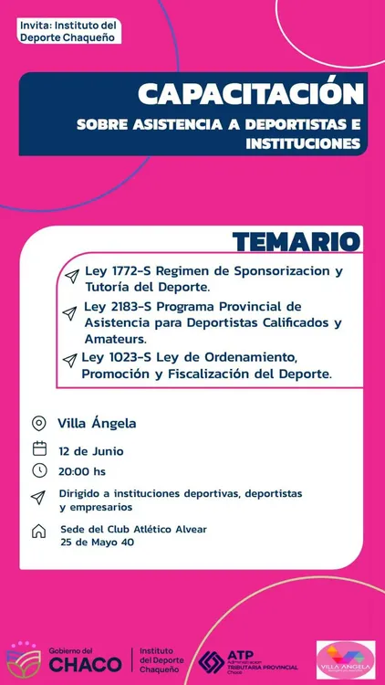 El próximo 12 de junio, el programa Chaco Capacita en Deportes del Instituto del Deporte Chaqueño, se trasladará a la localidad de Villa Ángela, para una jornada de capacitación sobre asistencia a deportistas e instituciones. La misma se realizará en el Club Atlético Alvear (25 de Mayo 40) y dará inicio a las 20:00 Hs.
