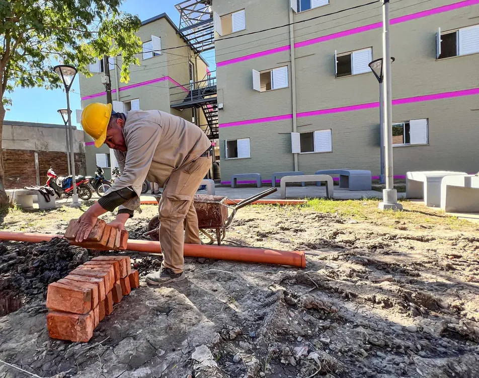 La intervención actual abarca el primer bloque de nueve departamentos del sector femenino, en la manzana 15. Los trabajos incluyen el reemplazo de columnas externas fisuradas, reparación de revoques, pintura interior y exterior, limpieza general, recambio de carpinterías por nuevas de aluminio, instalación de pisos, cielorrasos y revestimientos cerámicos.