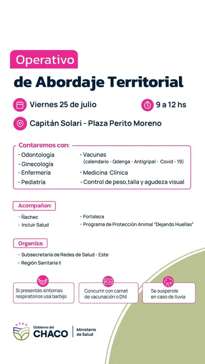 Este viernes 25 de julio, de 9 a 12 horas, el gobierno provincial llevará a cabo un nuevo Operativo de Abordaje Territorial en la Plaza Perito Moreno de la localidad de Capitán Solari, con múltiples servicios de salud y acompañamiento integral para la comunidad.